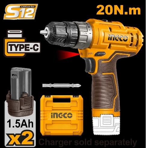 INGCO Дрель аккумуляторная Li-Ion 12W 1,5Ач 2шт/ 20 Нм/ 15+1/ USB type-C