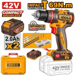 INGCO Дрель аккумуляторная ударная SUPER INDUSTRIAL Li-Ion 42Vmax 2Ач 2шт/69 Нм/ 22+1+1