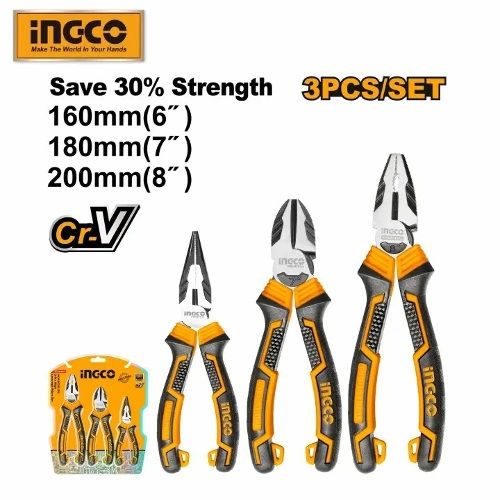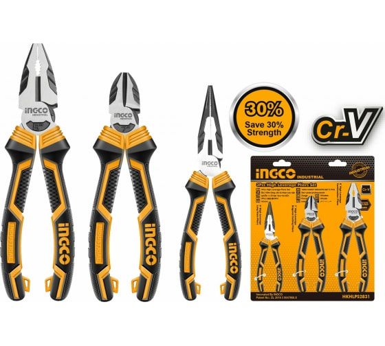 Набор шарнирно-губцевого инструмента усиленные 3 пред. INGCO HKHLPS2831 INDUSTRIAL - комплект шарнирно-губцевого инструмента, состоящий из трех предметов: комбинированных плоскогубцев, бокорезов и длинногубцев.Такой набор очень удобен для выполнения различных операций в области слесарно-монтажных работ.
