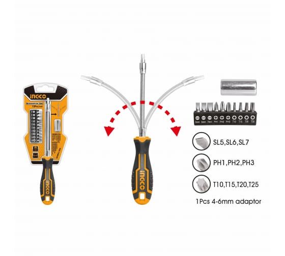 Отвертка с битами INGCO гибкая, 12 шт AKSDFL1208 применяется для работ с различными видами крепежа. Стержень имеет гибкую конструкцию и оснащен посадочным местом под биты с шестигранным хвостовиком на 1/4". Эргономичная двухкомпонентная противоскользящая рукоятка.