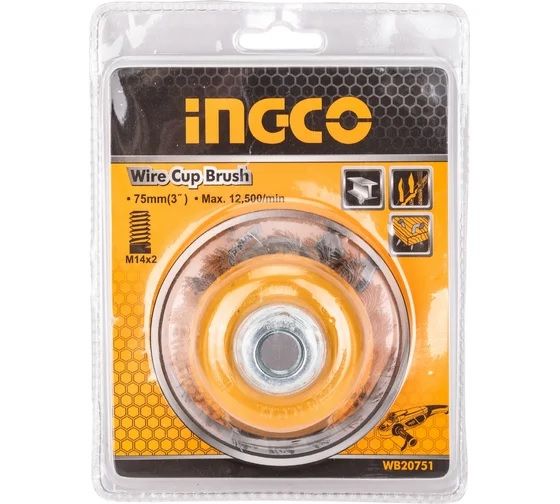 Щетка чашечная INGCO WB20751 используется для работы с УШМ. Служит для зачистки поверхностей покрытых лаком, краской, подходит для устранения ржавчины на металлических изделиях.
