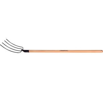 Рабочая часть имеет 4 зубца. Они выполнены из высокопрочной стали с защитным антикоррозийным покрытием. Черенок - деревянный (эвкалипт), удобно лежит в руке.
